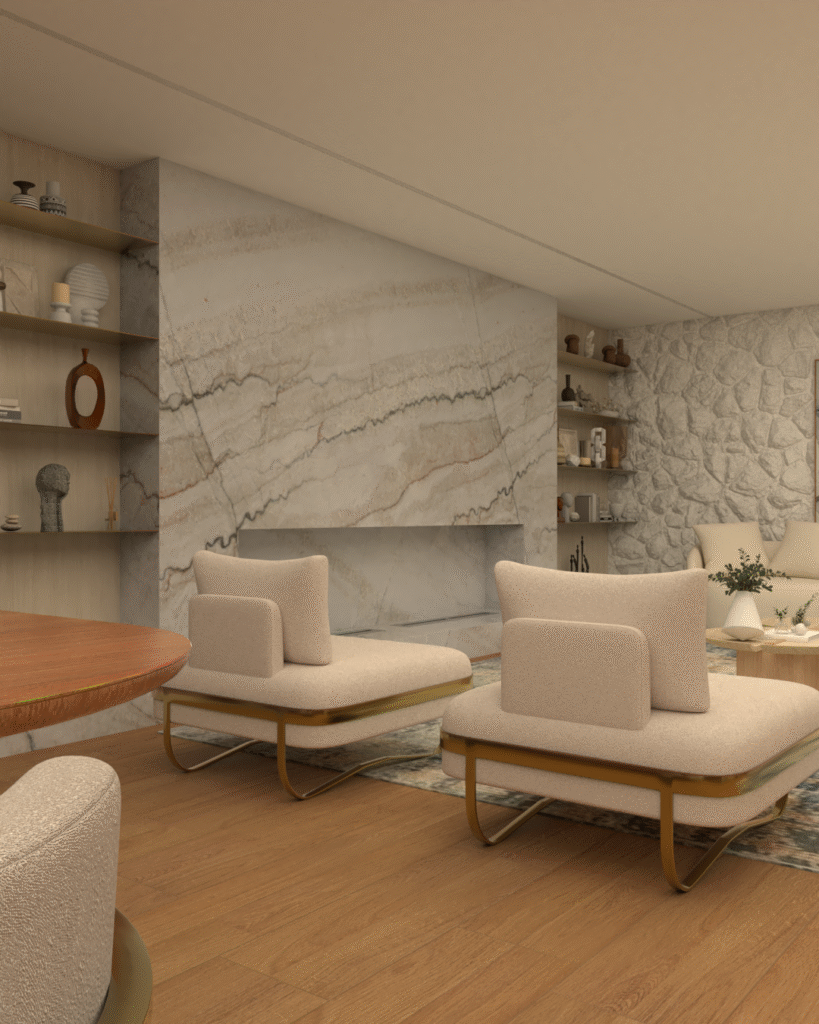 Em projetos como o Apartamento PK e o Apartamento ME, trabalhei a integração de forma que cada espaço tivesse identidade, mas conversasse de maneira equilibrada.