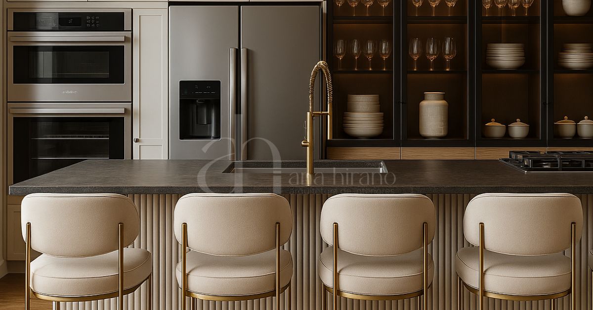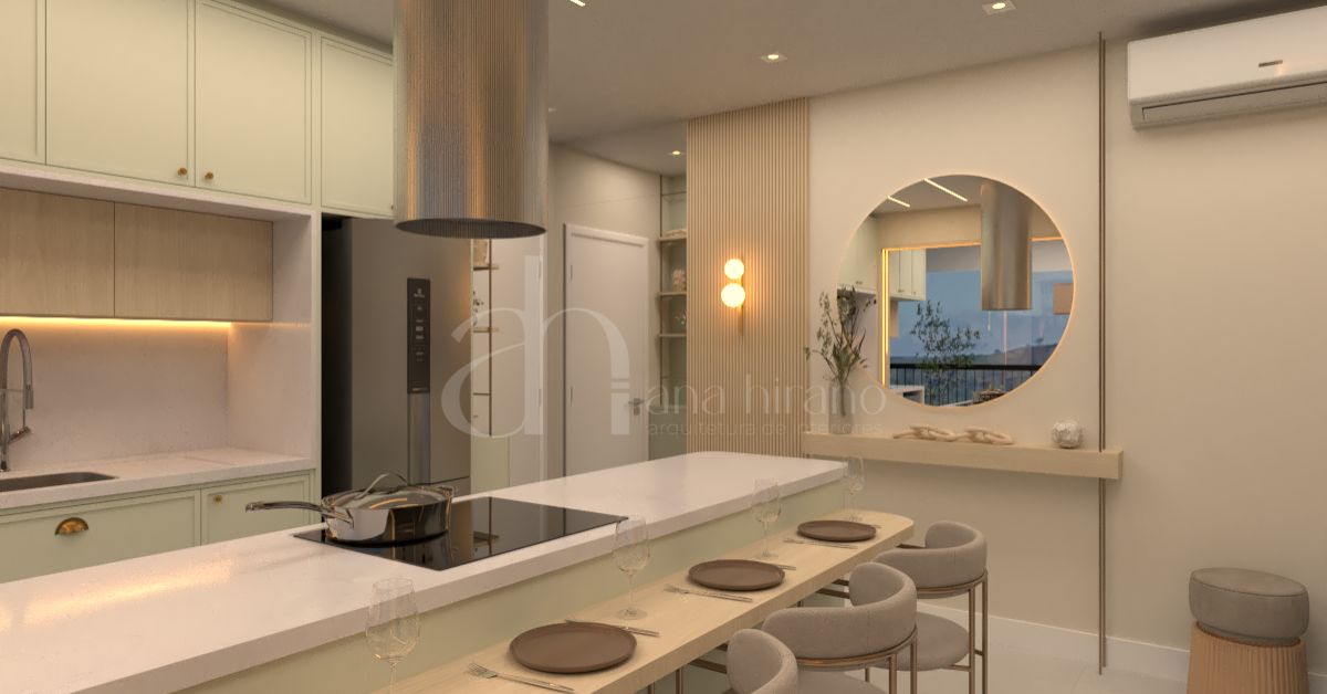 Mobiliário complementar, como mesa próxima à ilha da cozinha